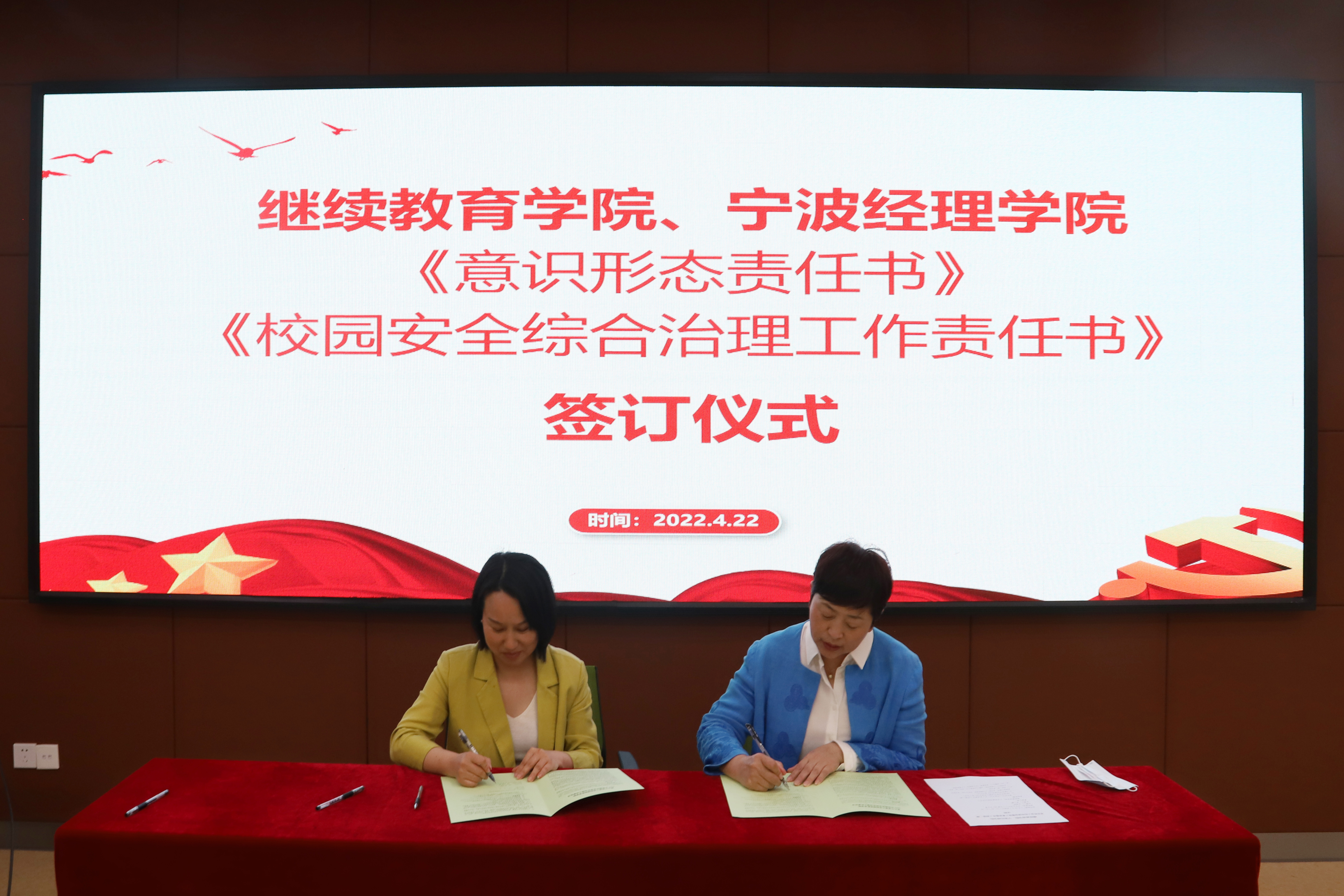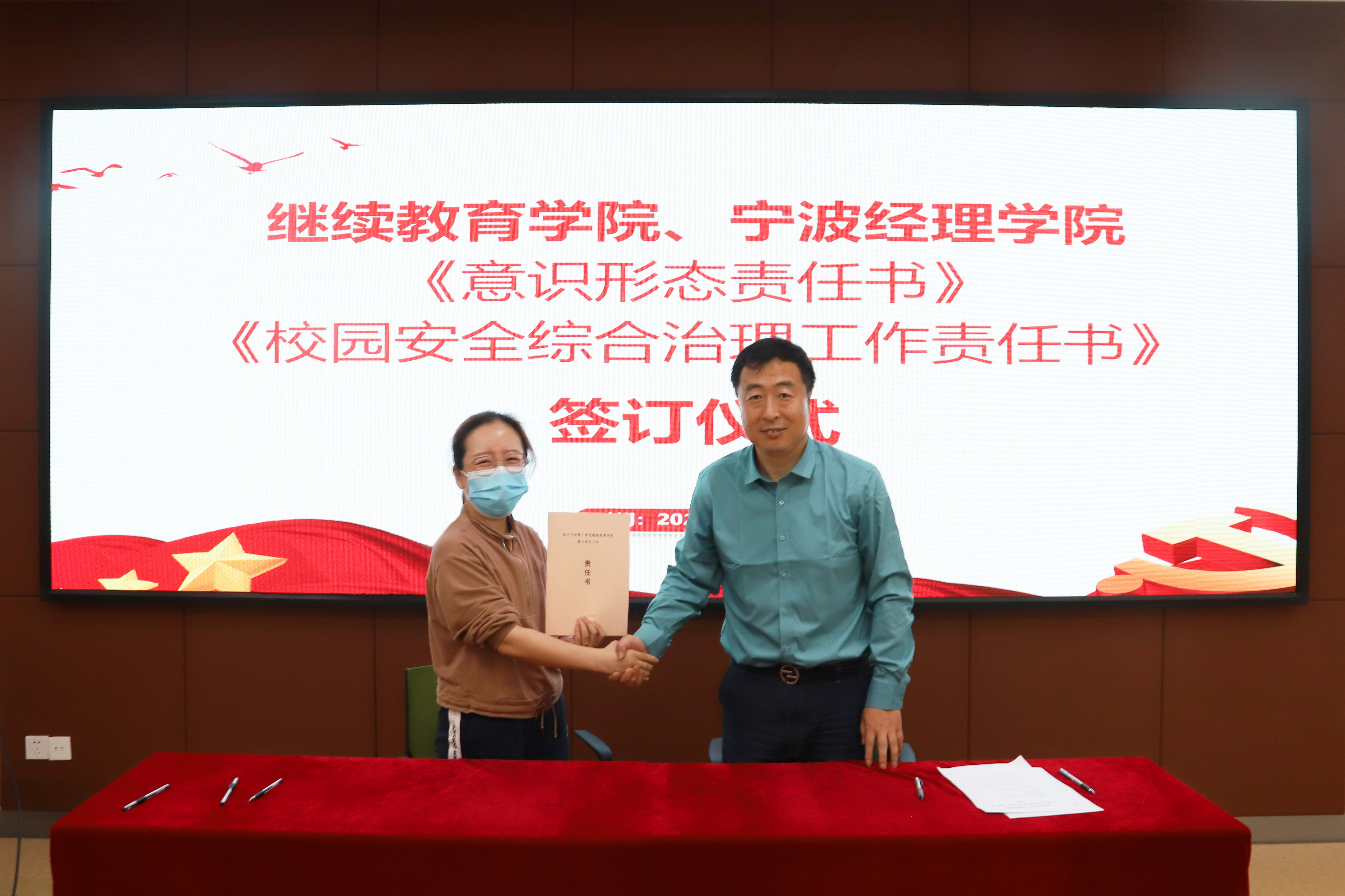 会上,金朝晖、贾小鹏与学院各部门负责人签订《意识形态责任书》和《校园安全综合治理工作责任书》。
