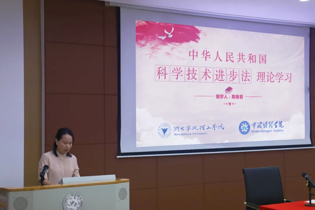 随后,宁波经理学院综合办公室主任陈维君领学《中华人民共和国科学技术进步法》。《中华人民共和国科学技术进步法》的修订,对于进一步提升科技创新质量和效率,进一步激发科技创新活力,推动高校科技创新事业高质量发展,有积极而重要的作用。作为培训单位,我们要充分把握其重大意义,加强宣传教育,围绕中心,结合深化党史学习教育,结合“提质增效 争创一流”行动,持续做好科普工作阵地支撑和重要会议活动服务保障。