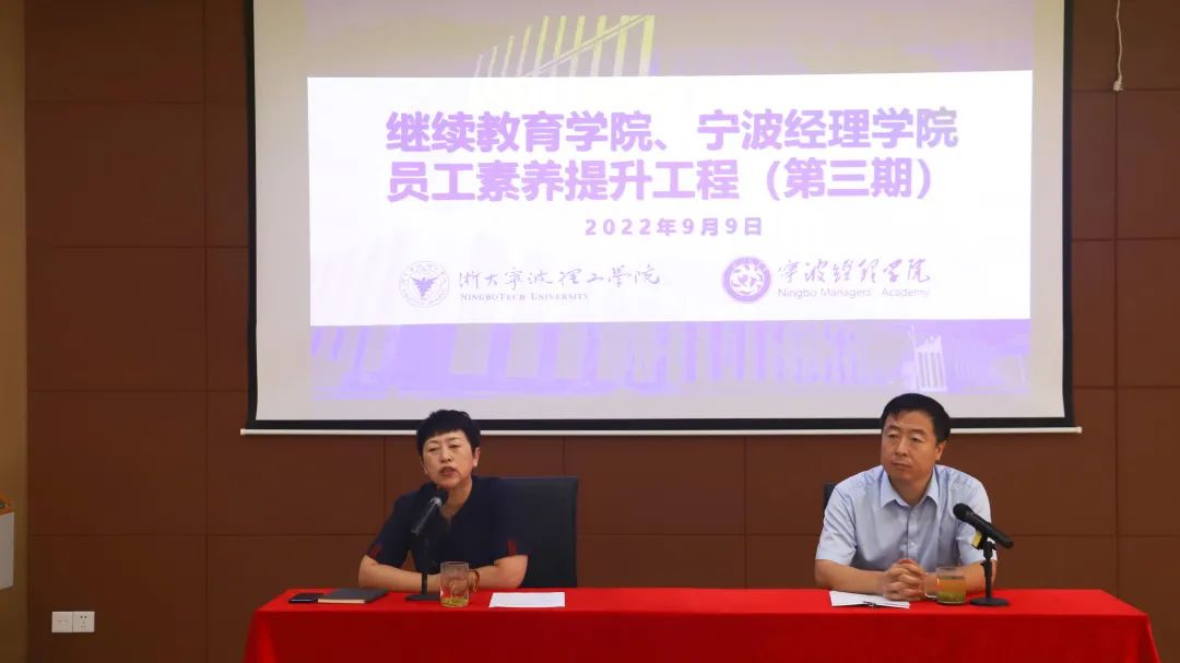 9月9日,宁波经理学院第三期员工素养提升工程在学术交流中心401会议室启动。学院领导和全体教职员工参加培训会。宁波经理学院执行院长金朝晖主持培训会。